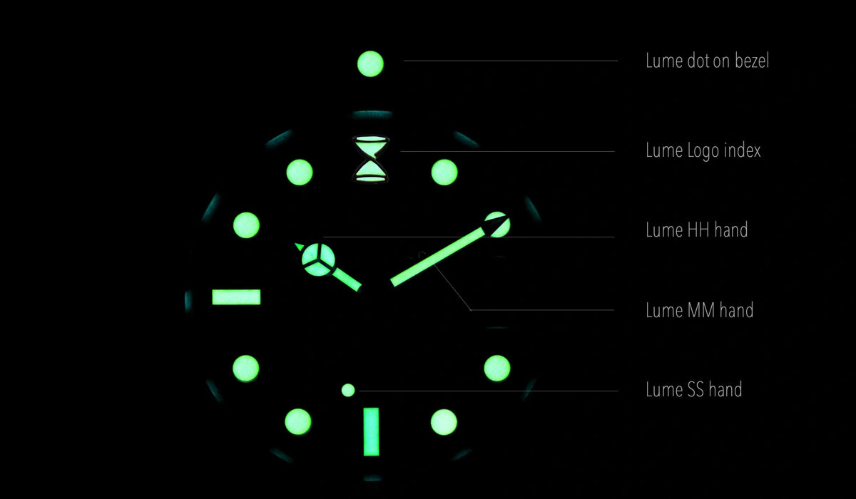 - Swiss Super-LumiNova C3 on hands, indexes